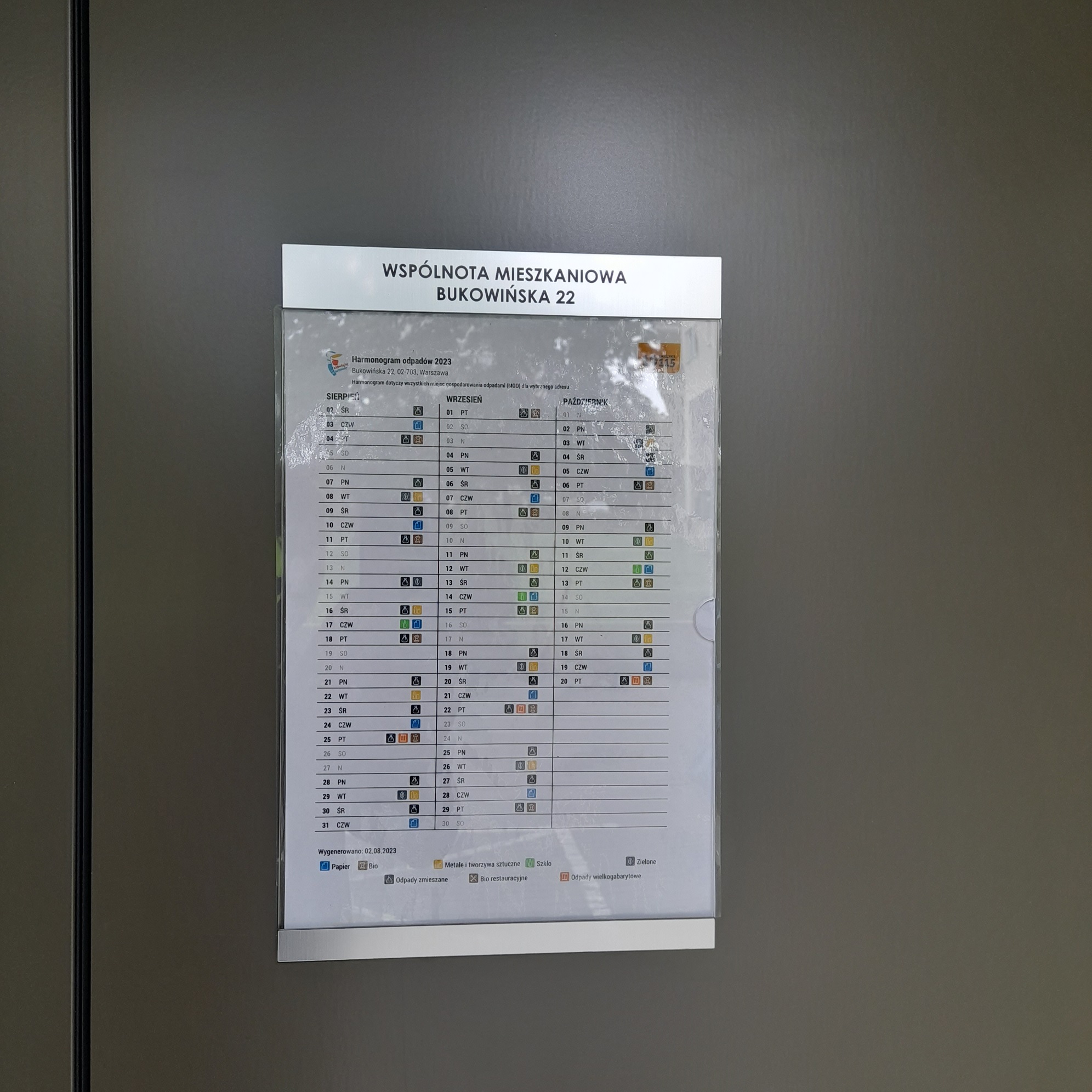 Informujemy, że na drzwiach komory śmietnikowej została zawieszona specjalna ramka zawierająca harmonogram wywozu odpadów. Dzięki temu rozwiązaniu będziecie Państwo mieli łatwy dostęp do aktualnych informacji dotyczących terminów odbioru różnego rodzaju odpadów. Harmonogram wywozu odpadów w ramce zawiera daty i odbioru dla poszczególnych rodzajów odpadów.